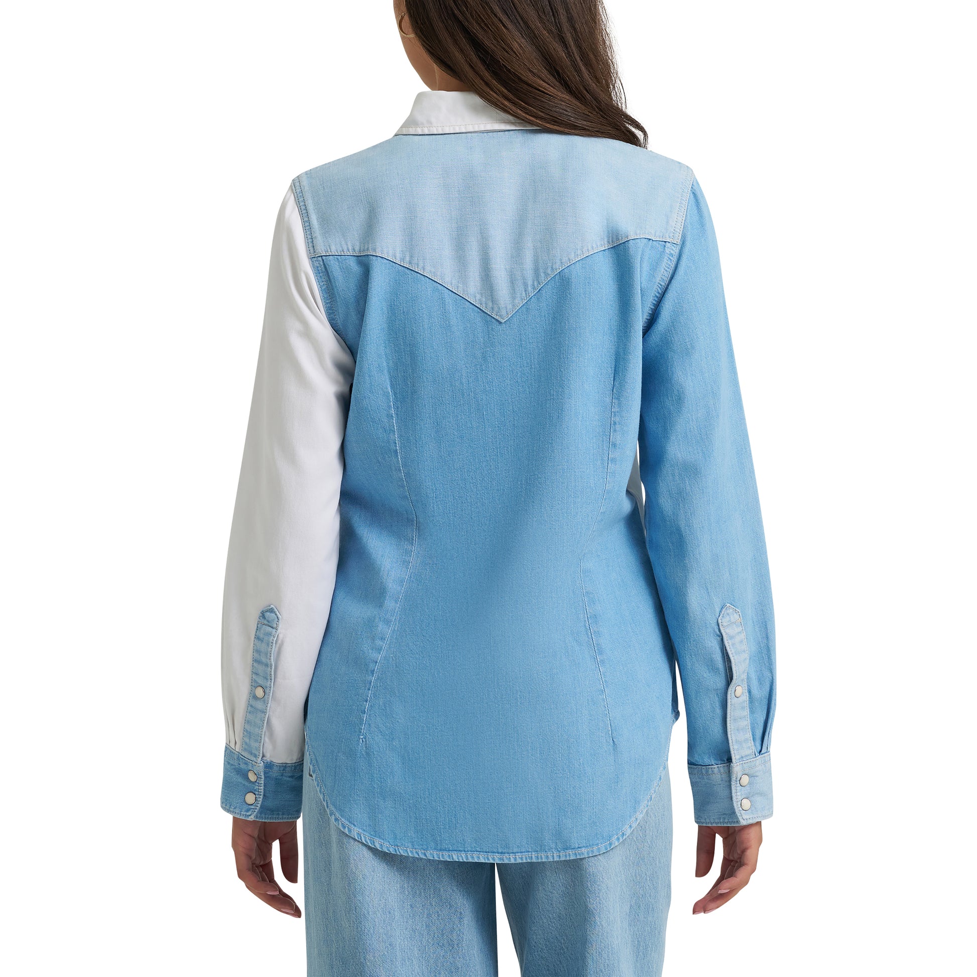 Wrangler's Retro® Boyfriend Denim Snap Shirt combines vintage charm with contemporary edge through its striking color-blocked design. Crafted from 100% cotton, this relaxed-fit piece features multiple denim washes across paneled construction—delivering authentic Western style with modern flair. The spread collar, long sleeves, and three-snap cuff closure create a polished yet effortless look that transitions seamlessly from casual to dressed-up occasions. Whether layered or worn solo, this boyfriend-cut snap shirt makes an undeniable statement while keeping you comfortable all day long.