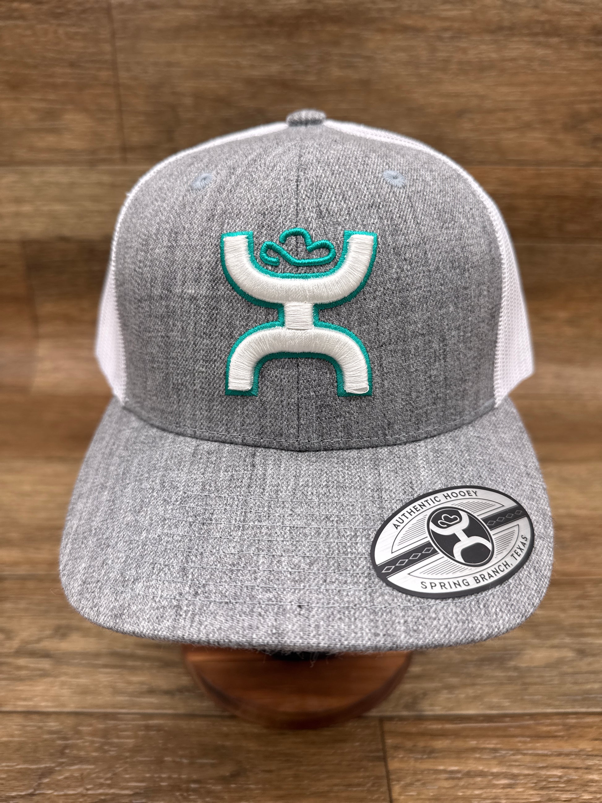 - Discover timeless style with this sterling grey and white Hooey cap that showcases a vibrant turquoise and white logo. The six-panel design provides a comfortable, structured fit that complements any outfit, while the mid-profile curved bill offers practical sun protection without overwhelming your face. Featuring a one-size-fits-all snapback closure, this cap adjusts easily for a personalized fit. Ideal for those who appreciate quality craftsmanship and authentic Western heritage, this versatile cap transitions seamlessly from ranch to town.