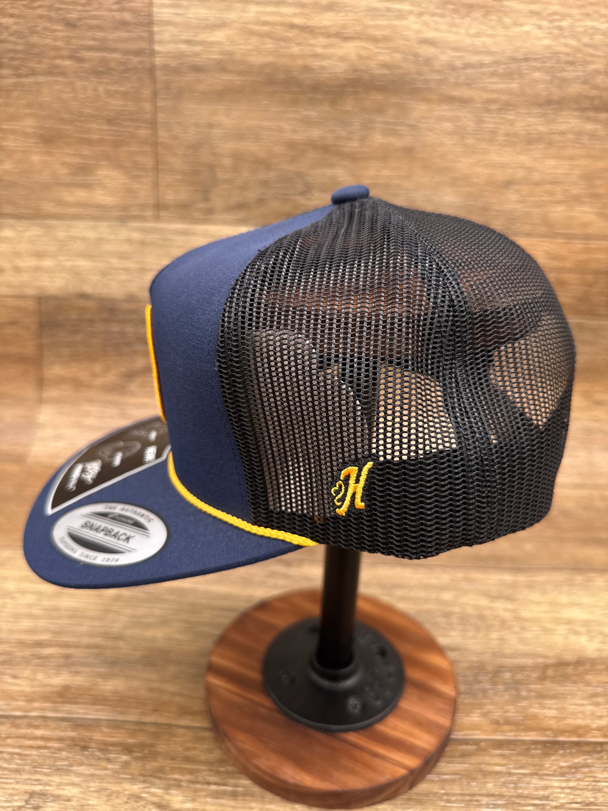 - Stand out with the Rose Hog cap's bold navy base and striking white and yellow circle patch. Crafted from durable Odessa fabric, this high-profile 5-panel design commands attention with confident style. The vibrant circle patch celebrates outdoor heritage and hunting passion, while the curved bill delivers classic Western appeal. Snapback closure provides secure, adjustable comfort for all sizes. Perfect for hunters, outdoor enthusiasts, and anyone who appreciates quality construction with distinctive character—this cap combines eye-catching design with reliable everyday wear.