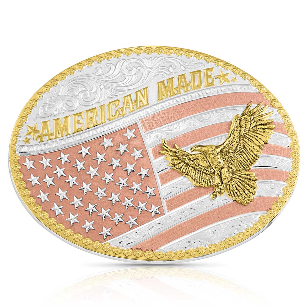 Created in collaboration with Coffey Anderson this line features American Made products that showcase our shared values of faith, family, and freedom. A flying American flag in silver tone with rose gold tone embellishments creates the background of the buckle. Expertly crafted with a gold tone sculpted flying bald eagle and the words "American Made". The design is finished with a gold tone beaded edge. Standard 1.5 inch swivel.