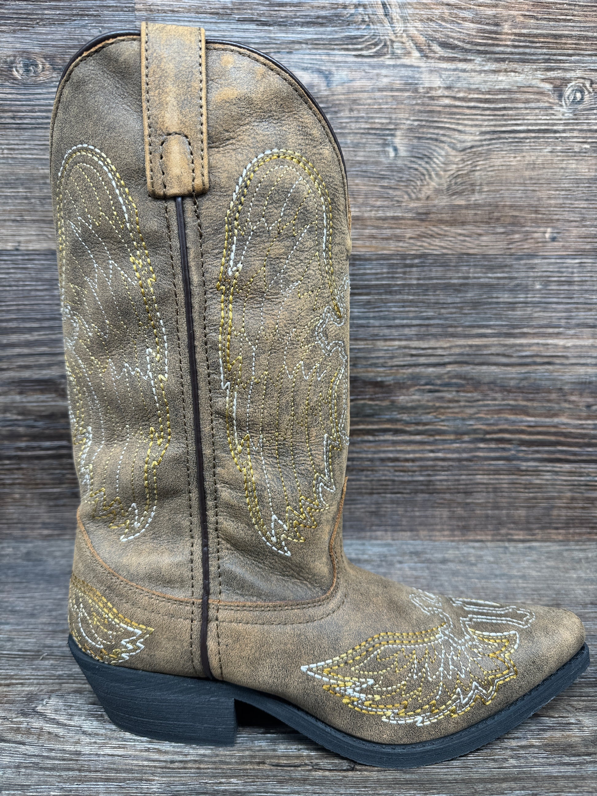 Crafted from top-quality full grain leather, these women's Guardian Western boots by Smoky Mountain feature a stylish snip toe, cushioned footbed, and intricate wing and cross embroidery. The leather lining and western heel provide ultimate comfort and style.