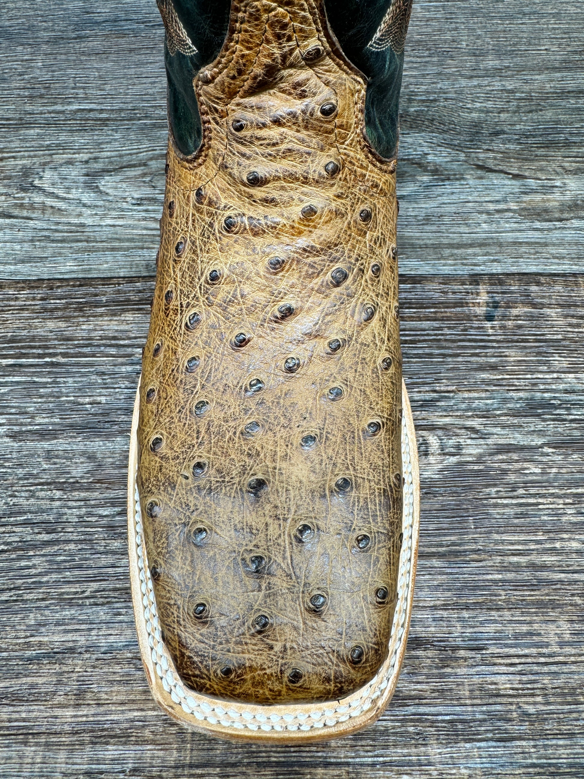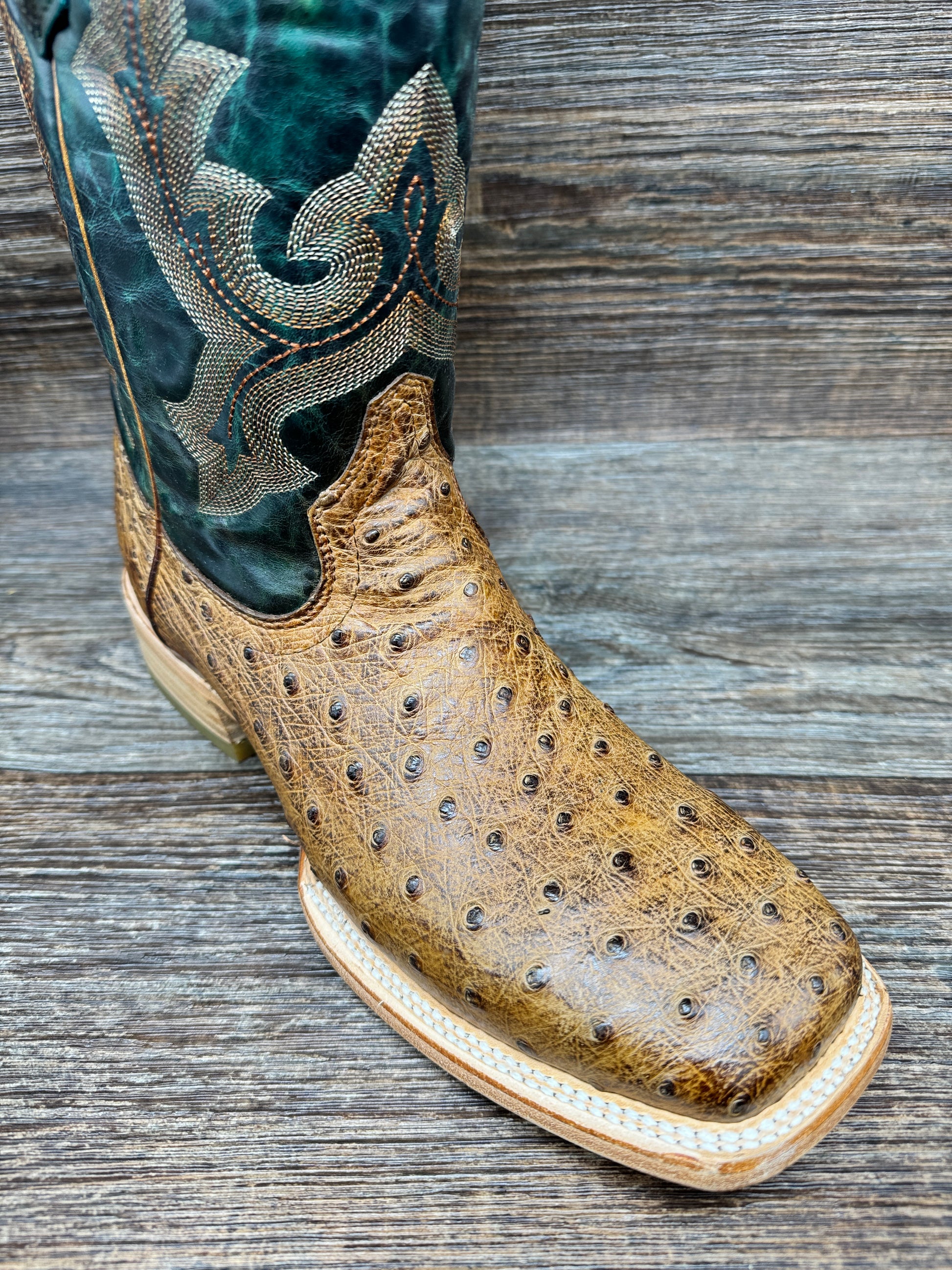 This A4533 cowboy boot boasts a unique combination of olive cowhide and tan ostrich materials, creating a striking and daring look. The 12-inch shaft is detailed with classic Western embroidery, adding to its tasteful design. With practical features such as pull-on straps, a leather outer sole, and a comfortable wide square toe, these eye-catching tan ostrich boots offer both style and comfort for all-day wear. In addition, the smooth leather lining, cushioned insole, and rubber inserts ensure comfort in any terrain.