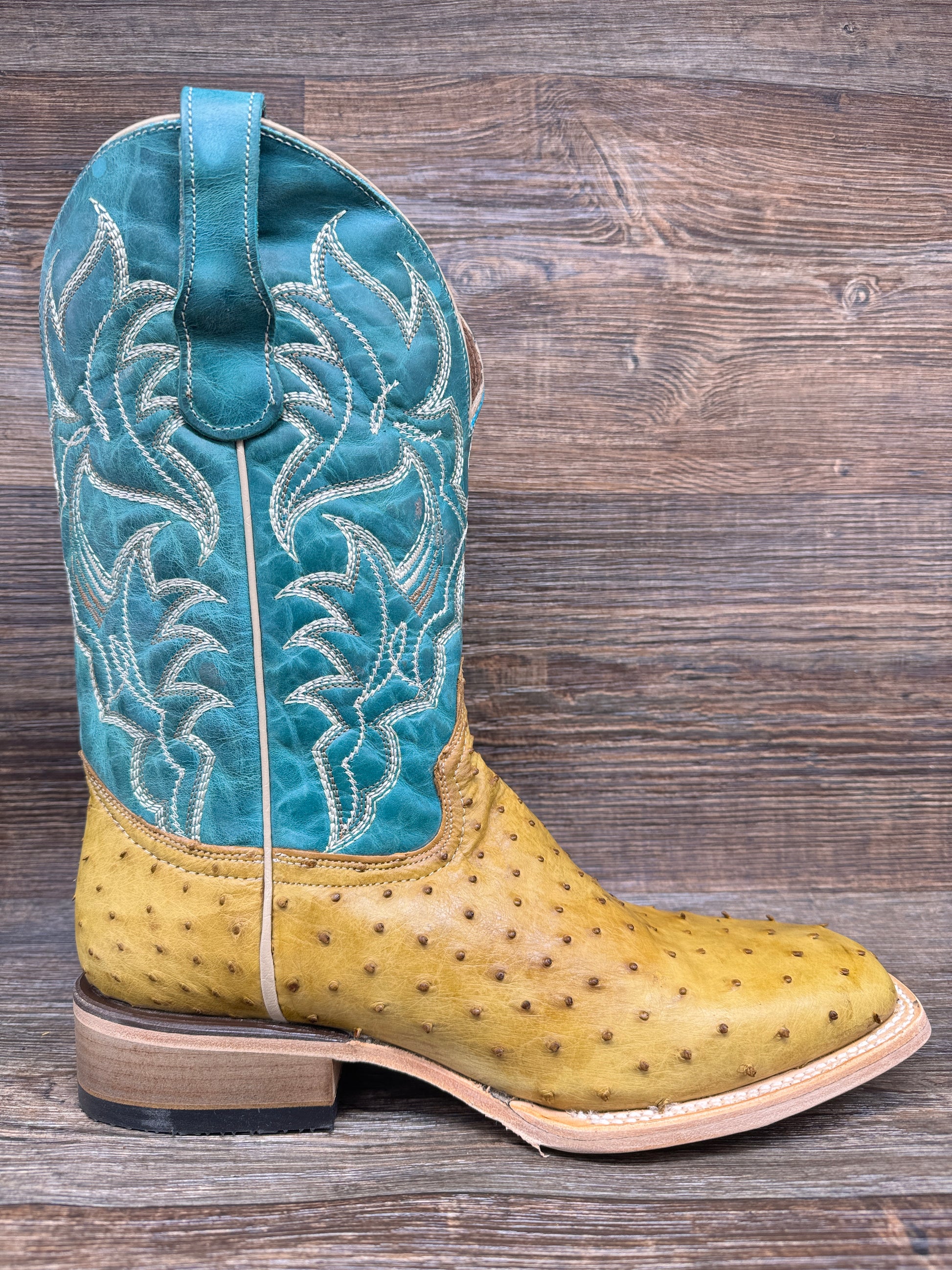 This L6139 cowboy boot boasts a unique combination of blue cowhide and sand ostrich materials, creating a striking and daring look. The 12-inch shaft is detailed with classic Western embroidery, adding to its tasteful design. With practical features such as pull-on straps, a leather outer sole, and a comfortable wide square toe, these eye-catching tan ostrich boots offer both style and comfort for all-day wear. In addition, the smooth leather lining, cushioned insole, and rubber inserts ensure comfort in any terrain.