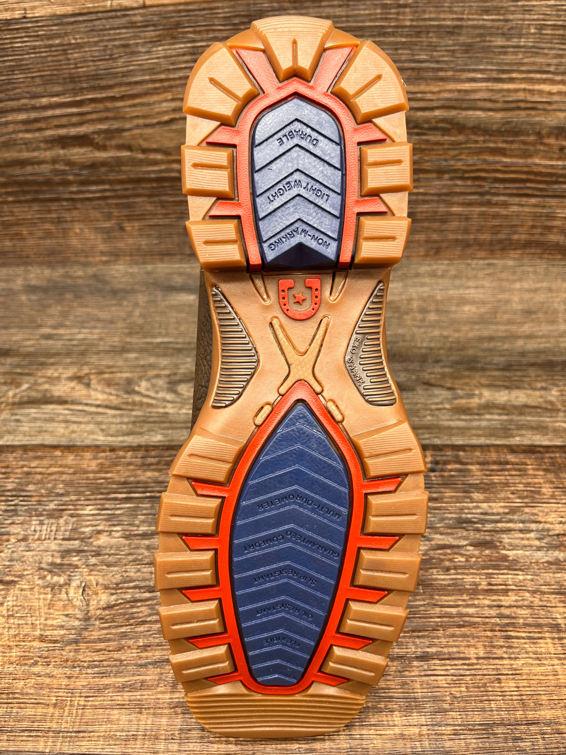 The midsole is dual-density with a firmer shock absorbing heel for added stability and a soft shock absorbing forepart for ultimate flexibility and comfort. The rolled shank area and anti-torsion rigid external shank provides added lateral stability and the outsole is multi-durometer rubber with high abrasion outer lugs for high impact durability and softer durometer mid lugs for added flexibility and increased slip and oil resistance. It has a single row sole stich around the square toe for added durability and a 1 ½" rocker heel.