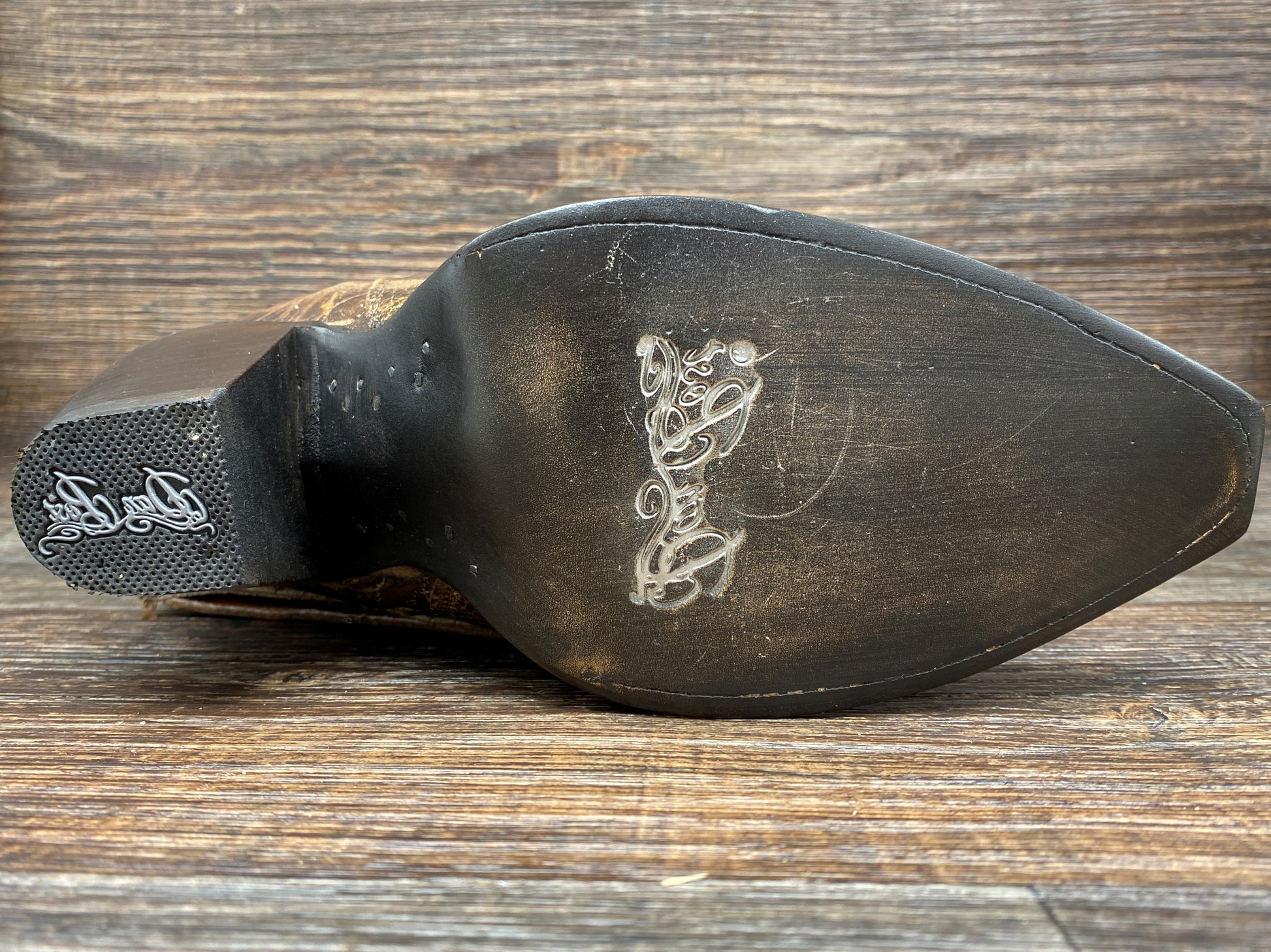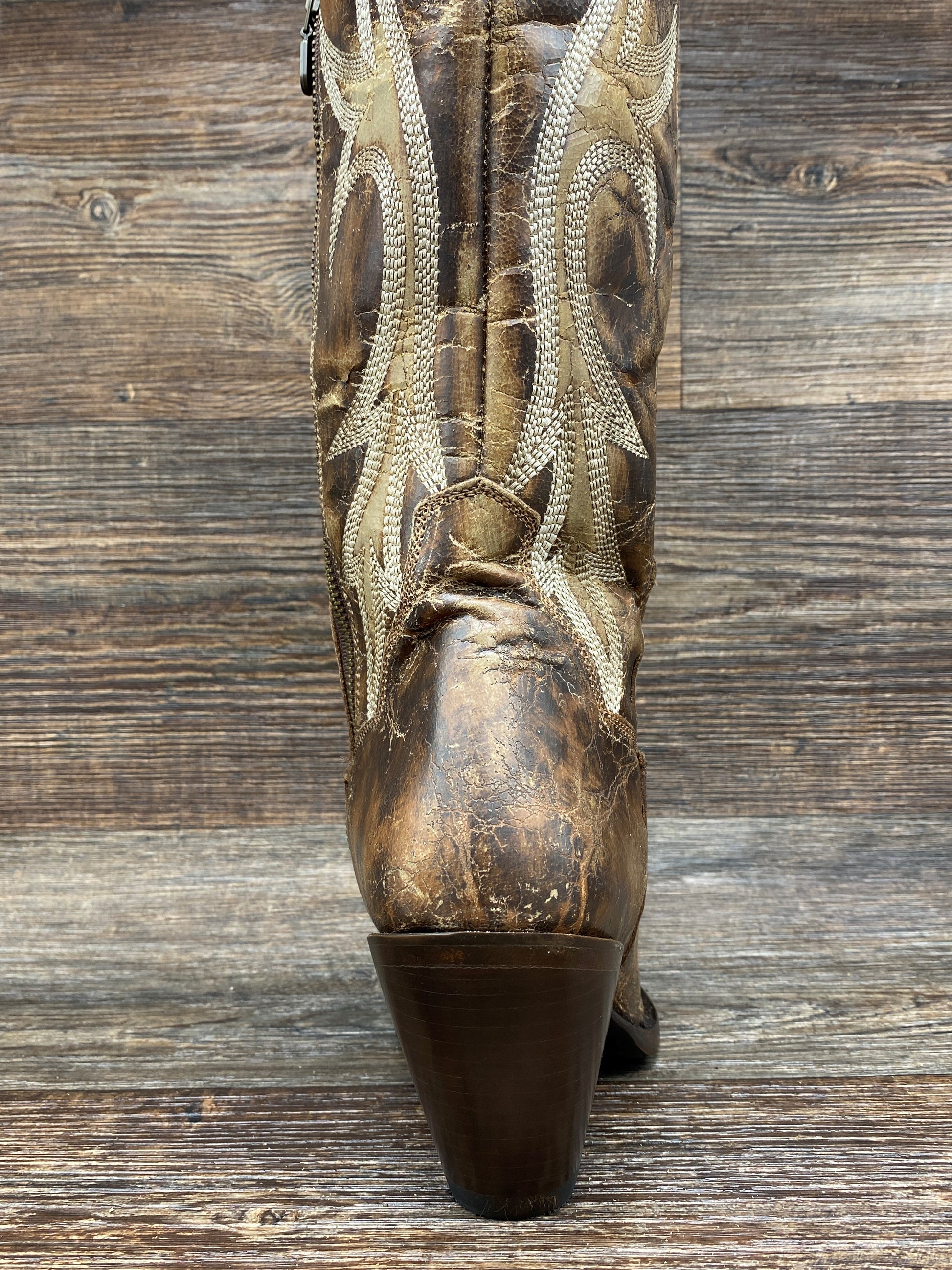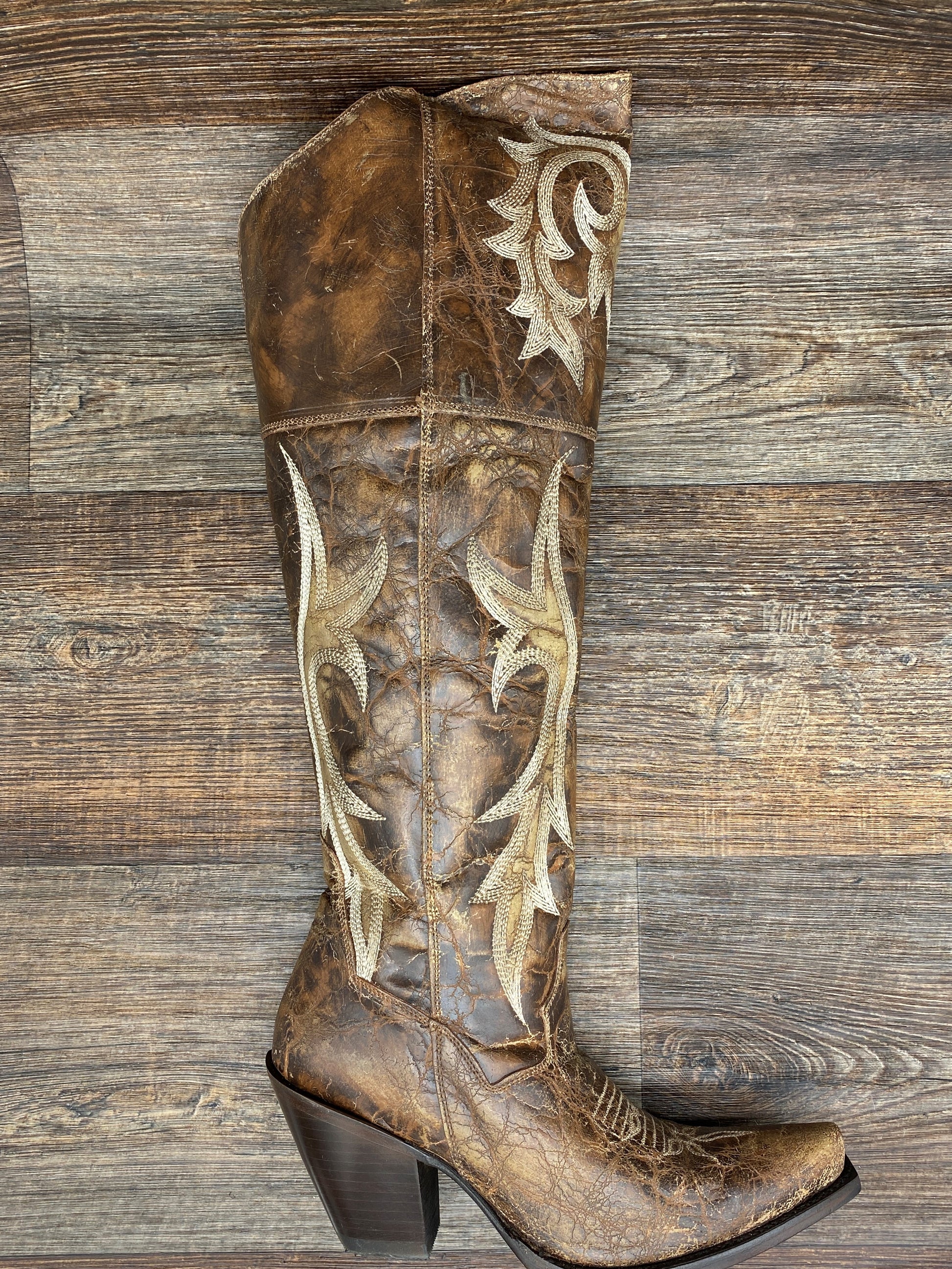 The Jilted boot is a show stopper with an over-the-knee, 20 height. Handcrafted with soft, distressed leather and western stitching throughout. It's dressed up with a high fashion heel, snip toe and leather outsole. An inside zipper makes it easy to step in and go.