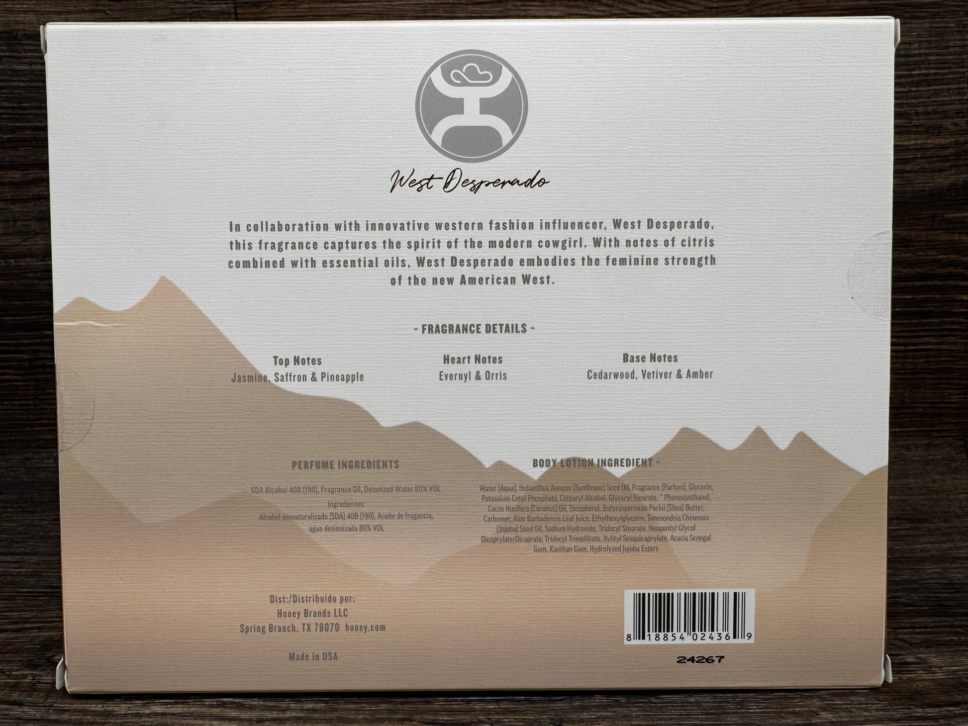 Discover the fearless spirit of the modern cowgirl with our West Desperado x Hooey Perfume Gift Set. Created in collaboration with western fashion influencer, West Desperado, this set features a unique blend of citrus and essential oils. Immerse yourself in notes of jasmine, saffron, pineapple, evernyl, orris, cedarwood, vetiver, and amber. Perfect for those who crave adventure and feminine strength. Includes a 1.7 oz perfume bottle, 0.33 oz travel perfume bottle, and 4 oz body lotion. Embrace the wild side and unleash your inner cowgirl with this must-have set!